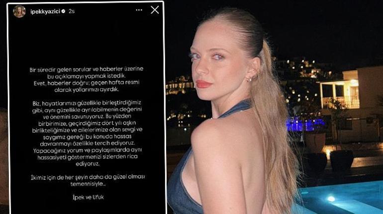 ”Bir süredir gelen sorular ve haberler üzerine bu açıklamayı yapmak istedik. Evet, haberler doğru; geçen hafta resmi olarak yollarımızı ayırdık. Biz, hayatlarımızı güzellikle birleştirdiğimiz gibi, aynı güzellikle ayrılabilmenin değerini ve önemini savunuyoruz. Bu yüzden birbirimize, geçirdiğimiz dört yılı aşkın birlikteliğimize ve ailelerimize olan sevgi ve saygımız gereği bu konuda hassas davranmayı özellikle tercih ediyoruz. Yapacağınız yorum ve paylaşımlarda aynı hassasiyeti göstermenizi sizlerden rica ediyoruz. İkimiz için de her şeyin daha da güzel olması temennisiyle…İpek ve Ufuk”