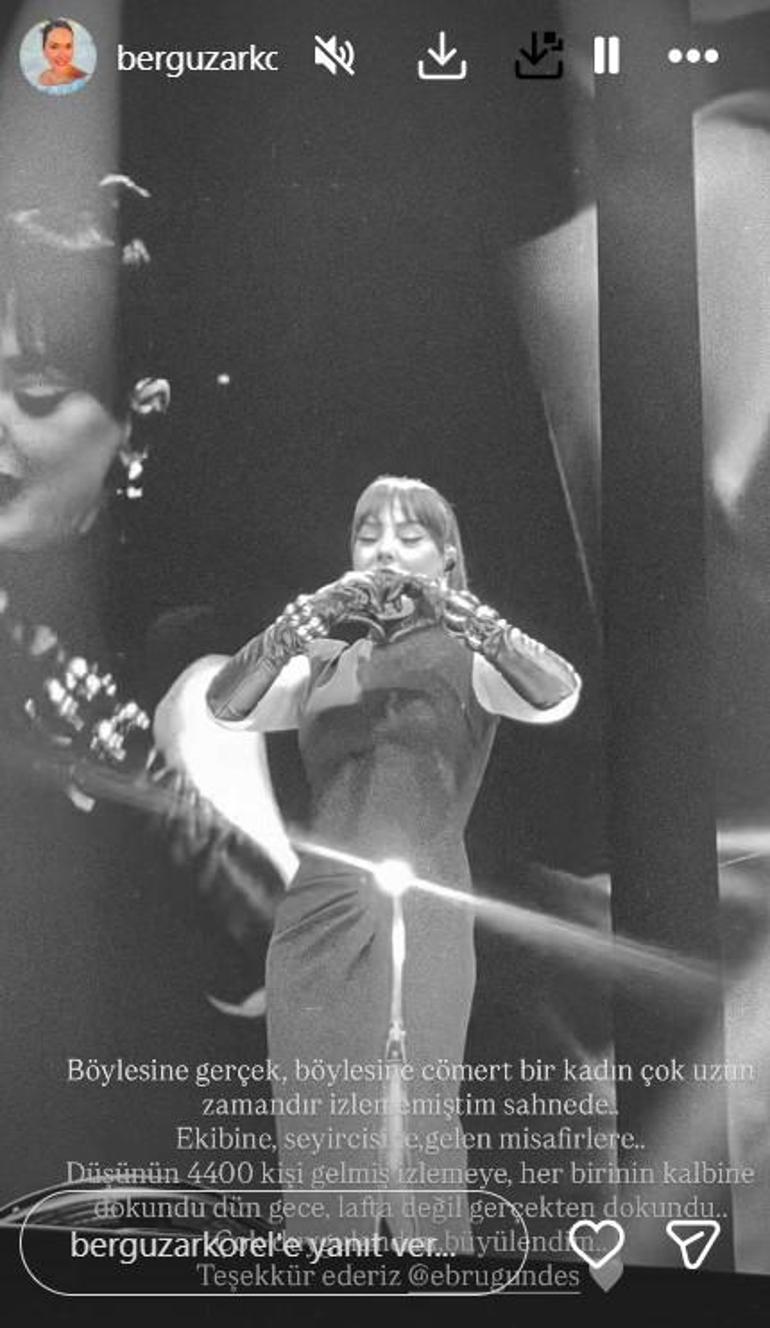 Türk müziÄŸinin güçlü sesi Ebru Gündeş’in son sahne gösterisi, izleyenlerden büyük beÄŸeni topladı. Oyuncu Bergüzar Korel de konseri izleyenler arasındaydı. Korel, GündeÅŸ’in performansına hayran kaldı.