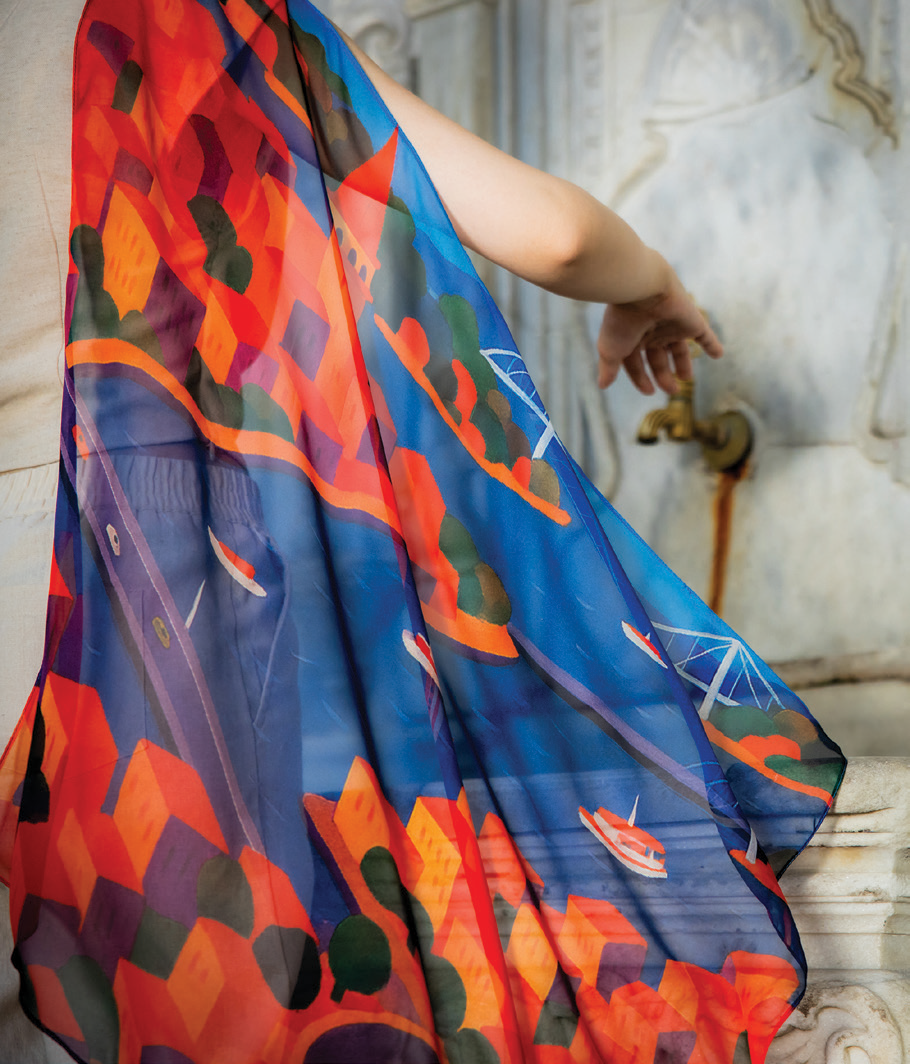 Neslişah Yılmaz: Bu koleksiyon için tamamen yeni desenler ve renkler hazırladık. İstanbul’un yedi tepesinden ilham alan özgün bir hikayeyi fularlara yansıttım. Fularların desenlerinde İstanbul’un ikonik mekanları yer alıyor. Balat’ın renkli çamaşırlı evleri, İstanbul kedileri, Boğaz’da martılar ve vapurlar, köprü siluetleri, Galata Kulesi’nin gece manzarası, Beyoğlu tramvayı ve Taksim’in ışıklı görüntüsü, koleksiyonun desenlerine işlendi. Böylece İstanbul’un hem gündüz hem de gece ruhunu fularlara aktardık.