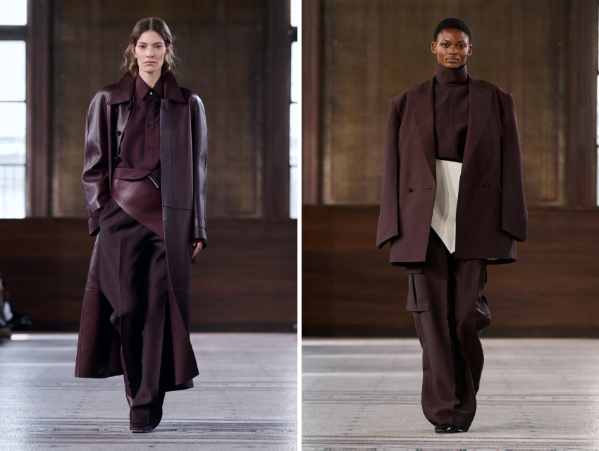 Renk paleti oldukça kontrollüydü: Bordo tonları, çikolata kahvesi, siyah, ekru ve kum rengi sıklıkla karşımıza çıktı. Ancak Thomas bu sade paleti dokularla derinleştirdi. Açılış görünümündeki maun tonlu deri palto; raglan kol kesimi, keskin bir gömlek, asimetrik deri kemer ve düz kesim pantolonla katmanlanarak güçlü bir silüet yarattı.