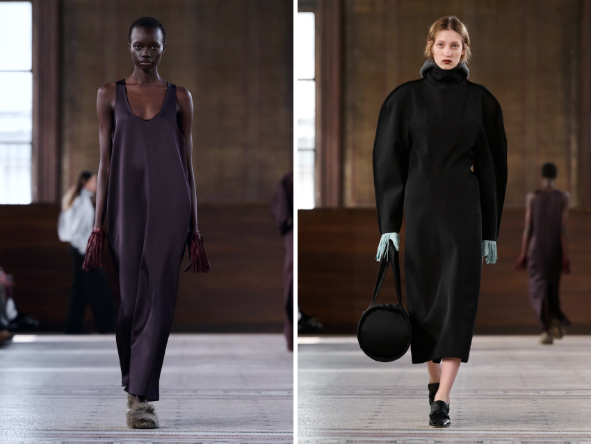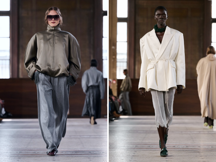 Tasarımcı bu sezon ayrıca “ev” fikrini iki farklı açıdan yorumladı. Bir yanda markanın couture mirasına gönderme yapan parçalar vardı: Çift ipek bluzonlar ya da 1950’lerin kimono formundan ilham alan üstler, ipek tual ve yün kumaşlarla hem heykelsi hem hafif bir yapı kazandı. Diğer yanda ise boudoir gardırobuna gönderme yapan daha rahat parçalar öne çıktı: Uzun elbiseye dönüşen atlet formu, organze parçalar ve lüks dış giyime dönüşen ev ceketleri vardı.