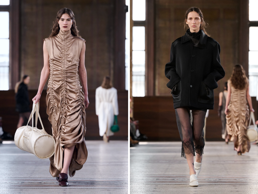 Yine de bu koleksiyonu yalnızca “daha olgun” olarak tanımlamak eksik olur. Thomas zaten güçlü bir tasarım dili ve iyi giyinen bir kadının gardırobuna nasıl yeni parçalar ekleyebileceğini bilen sezgisel bir bakışa sahip. Ancak bu sezon silüetlerde ve stil yaklaşımında daha özgüvenli bir tavır hissediliyor. Geniş kesimli terzilik ile daha rahat formlar arasında gidip gelen görünümler; monokrom katmanlar, dantel işlemeli organze slip elbiseler ve dokulu yüzeyler ile saten ve derinin pürüzsüzlüğü arasında dengeli bir kontrast kuruyor.