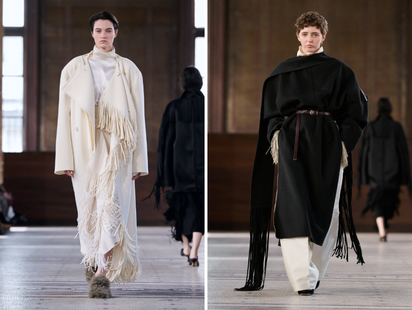 Sezonun öne çıkan trendlerinden biri olan püskül kullanımı Carven’de de görülse de Thomas’ın yorumu abartılı değil, daha doğal ve giyilebilirdi. Özellikle battaniye hissi veren paltolar, ev konforu ile şehir hayatı arasındaki sınırı silikleştiriyordu.