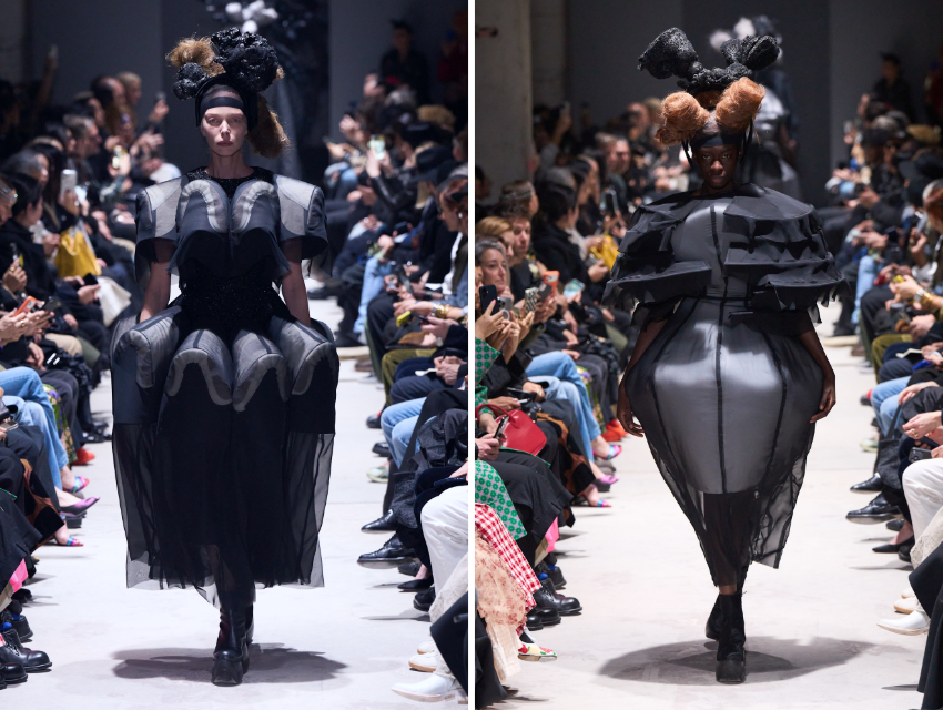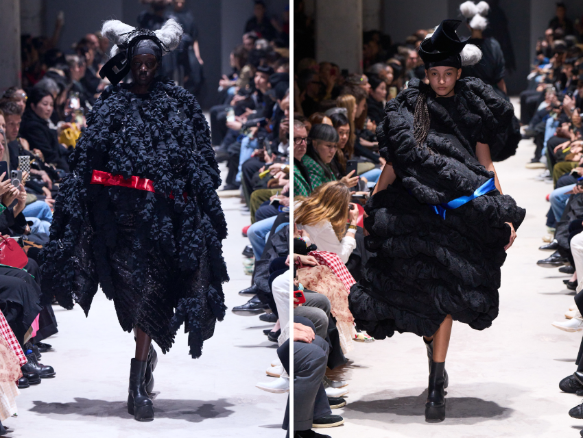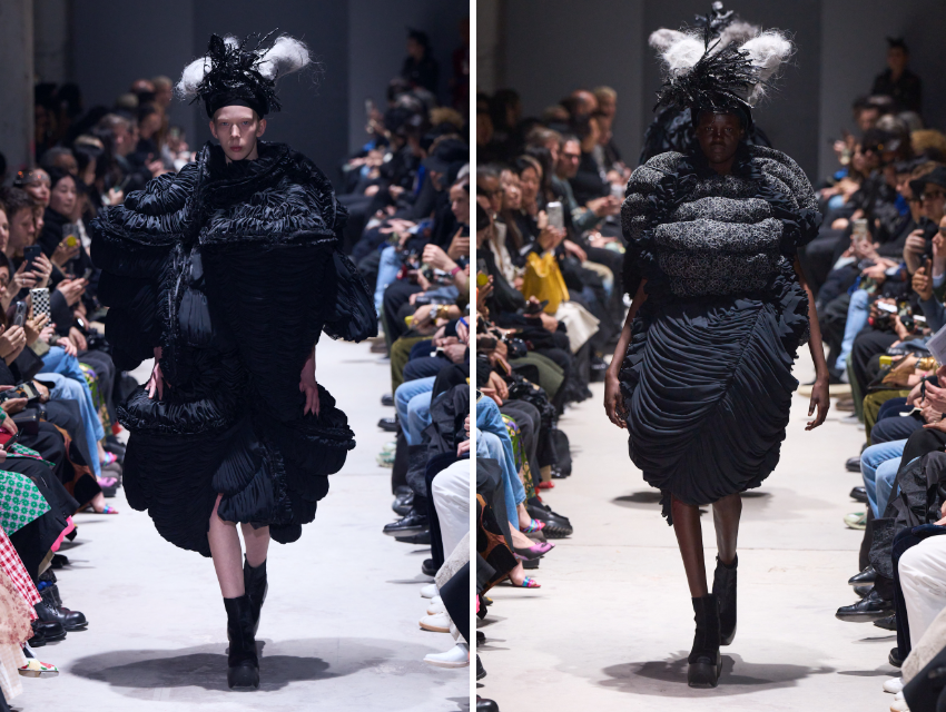Comme des Garçons Sonbahar/Kış 2026 koleksiyonunda Rei Kawakubo, siyahın farklı dokular ve heykelsi formlar aracılığıyla nasıl yeniden yorumlanabileceğini gösteriyor.