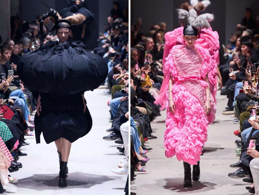 Kawakubo yalnızca siyahın içinde kalmadı. Bazı görünümlerde kırmızı, beyaz veya yeşil dolgulu saten kemerler hacimli formları vurgularken, kalça çıkıntıları beyaz dolgu katmanlarıyla desteklenmişti. Defilenin sonuna doğru gelen pembe tonlardaki hacimli elbiseler ise koleksiyona beklenmedik bir hafiflik ekledi.