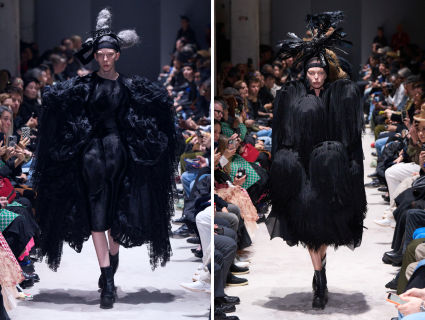 Geçen sezonun daha sert ve Brutalist silüetlerinden sonra bu defilede farklı bir denge dikkat çekiyor. Kawakubo bu kez karanlık yüzeylerin içine detay yerleştiriyor. Büzgüler, drapeler, katmanlar, tül dokunuşları ve ince nakış izleri büyük hacimli formların yüzeyini hareketlendiriyordu.