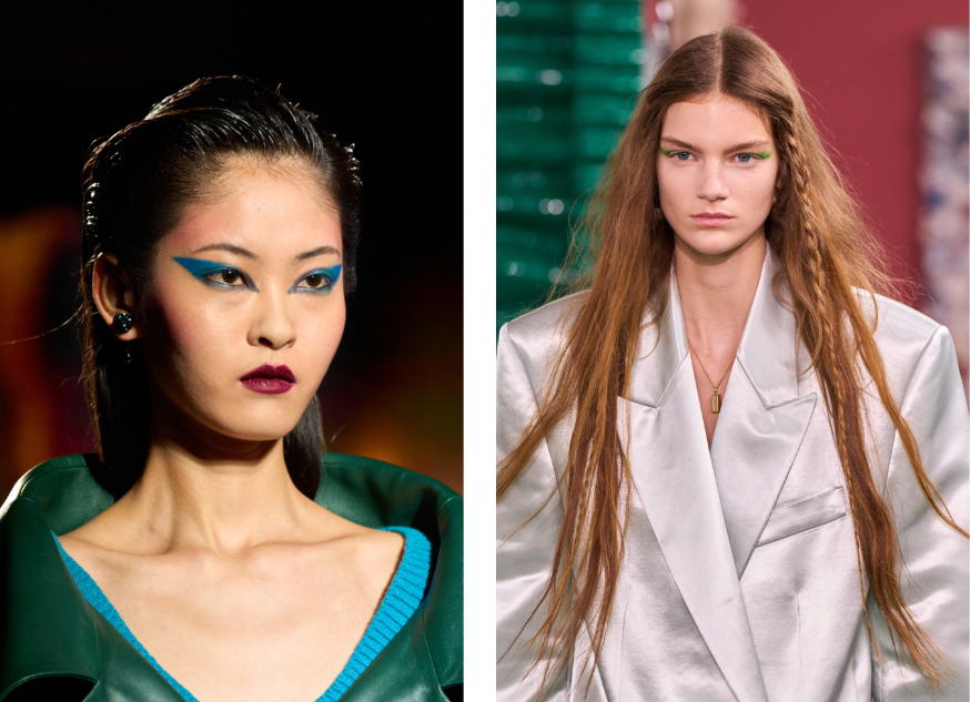 Renkli göz makyajlarına Milano Moda Haftası’nda rastlamıştık; Paris Moda Haftası’nda ise net görünümlü, canlı renkli eyeliner’lar öne çıktı. Bu keskin ve belirgin dokunuş, yaratılan silüetlere hem karizmatik hem de çarpıcı bir tavır eklerken sokağın dinamizmini de yükseltmeye devam ediyor. Önümüzdeki sezon makyajda renk oyunlarının ve keskin çizgilerin sıkça karşımıza çıkacağını şimdiden söyleyebiliriz.